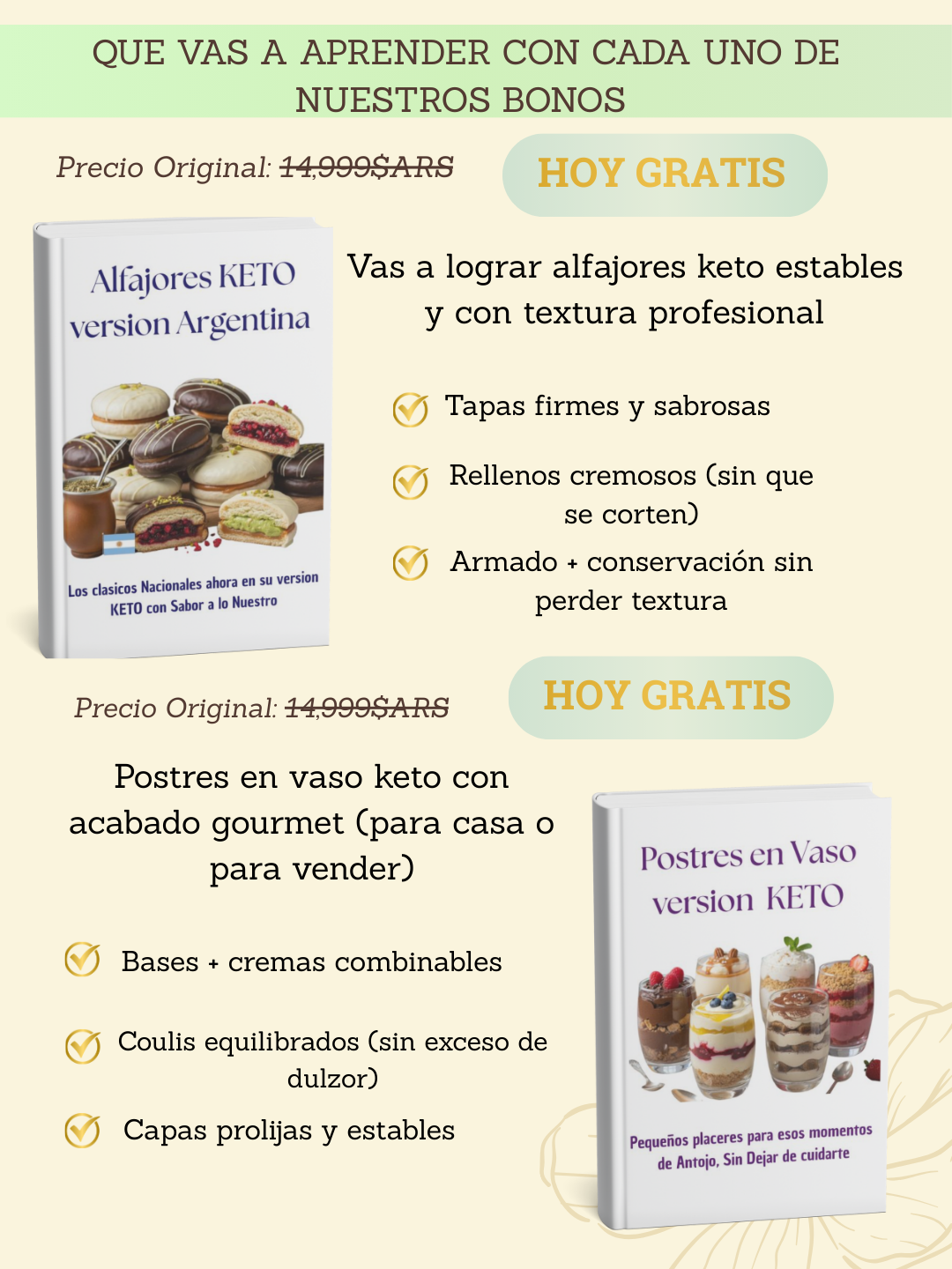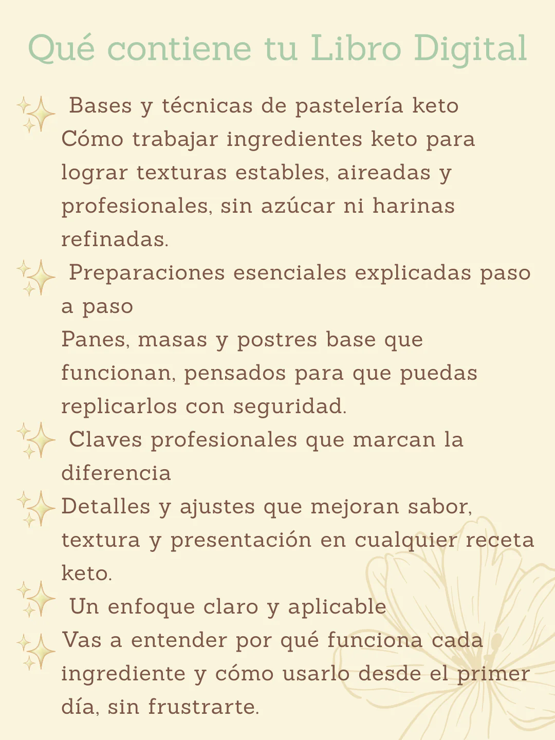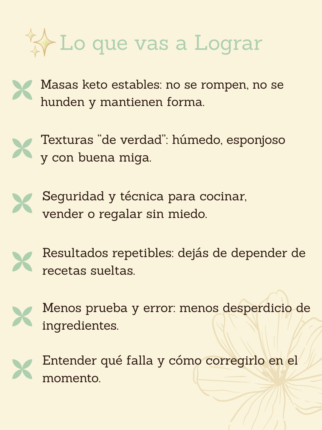 No. Está diseñado para acompañarte desde cero. Vas a aprender paso a paso los fundamentos que hacen que una receta keto salga perfecta, incluso si nunca cocinaste profesionalmente.